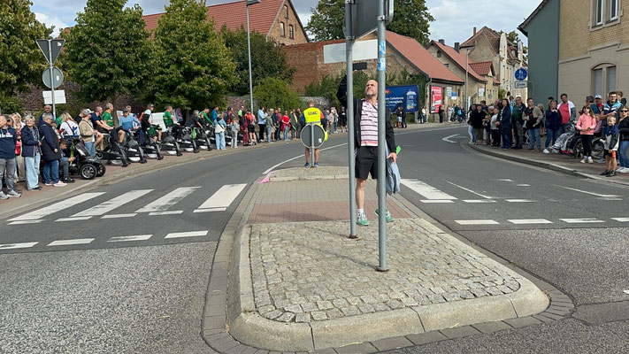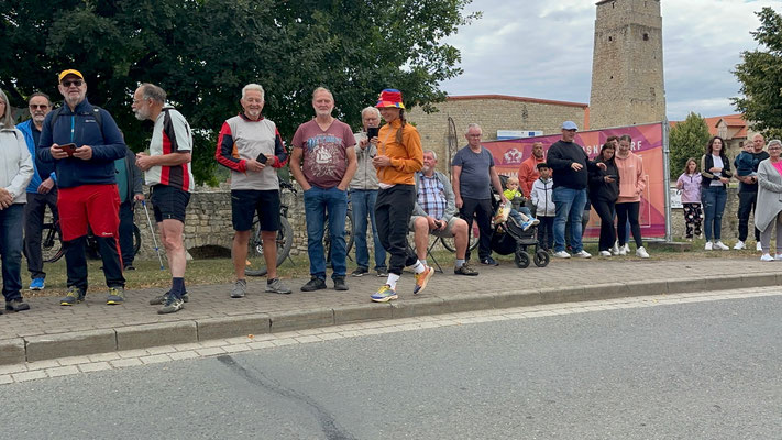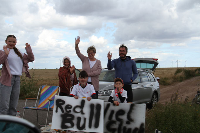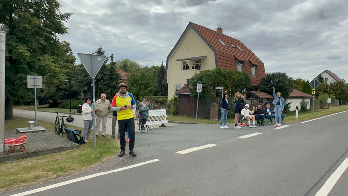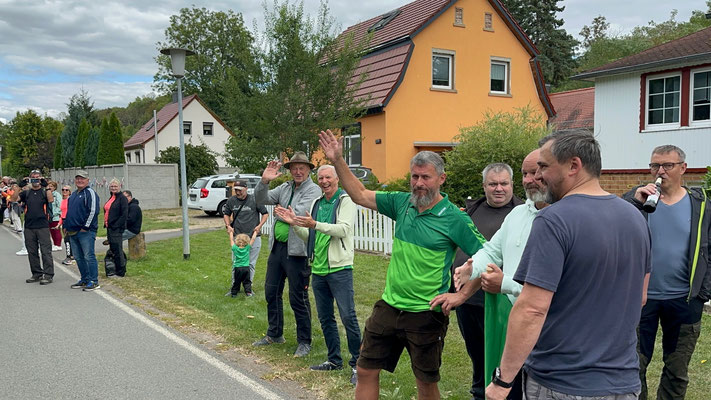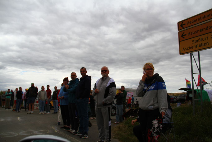 Die Begeisterung ist auch den Organisatoren der Tour aufgefallen. "Verrückt. Als wir die Strecke geplant haben, hatten wir in dieser Region nicht mit so einer Stimmung gerechnet!", so einer der Verantwortlichen der ASO - den Veranstaltern der Deutschland Tour. Michael Haas (Foto, der in der Mitte, Fotograf: Gottfried Bürger), zuständig u.a. für die Koordination der Hellfer aller Etappen, ist in Adersleben spontan aus dem Auto gestiegen und hat die Moderation im dortigen Stimmungsnest übernommen.