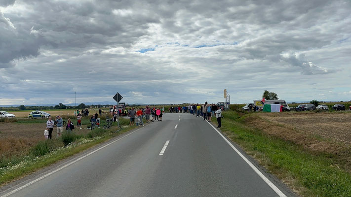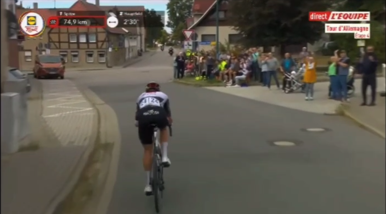 Das Stimmungsnest am Hofladen Hedersleben hat es sogar in die Tourzusammenfassung geschafft. Hier wurden der Fahrer Brandon McNulty (im Bild) und später auch alle anderen rund um den späteren Sieger Søren Wærenskjold mit den lauten Hupen von Traktoren und LKWs begrüßt. (Hier zur Zusammenfassung, die zur Zeit nur als Facebook Video vorliegt: https://www.facebook.com/DeutschlandDeineTour/videos/1963491831085184. Zuvor auch im Bild: die Burg Hausneindorf mit den davor stehenden Fans.