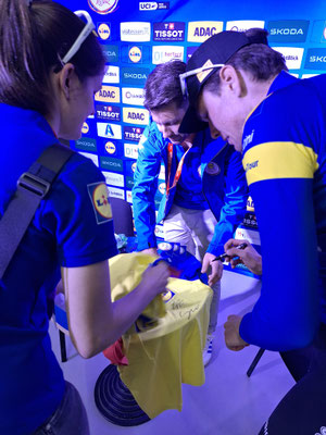 Tour Prominenz unterschreibt Trikot für das beste Stimmungsnest im SLK/Vorharz. Kommentator Rick Zabel, Søren Wærenskjoldder - Sieger Deutschland Tour, Maren Hopf - Head of Lidl Deutschland Tour - A.S.O. Germany GmbH und Streckenchef Fabian Wegmann.