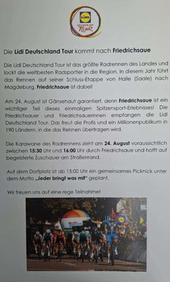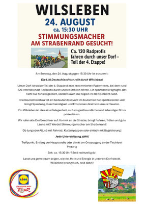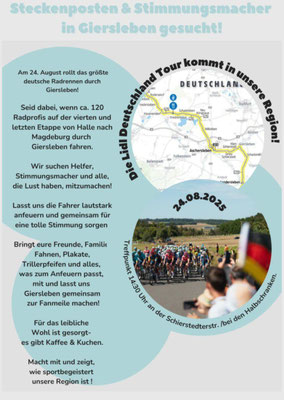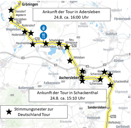 Die Region freut sich auf ein einmaliges Ereignis: An immer mehr Orten entlang der Strecke werden Stimmungsnester und Hot Spots geplant. In Schackenthal, Kl./Gr. Schierstedt, Aschersleben, Schadeleben, Friedrichsaue, Hausneindorf, Hedersleben...