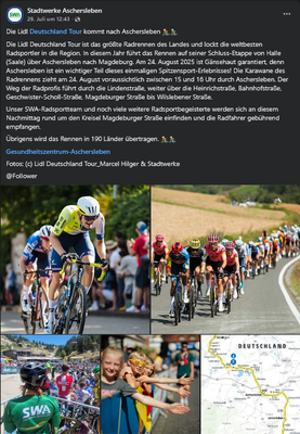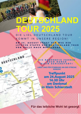 Die Lidl Deutschland Tour kommt am 24. August auf dem Weg von Halle nach Magdeburg durch den Salzlandkreis und den LK Harz. Hier kann man internationalen Spitzensport der Weltklasse hautnah erleben! Am besten geht das gemeinsam mit Freunden und anderen Radsportbegeisterten...