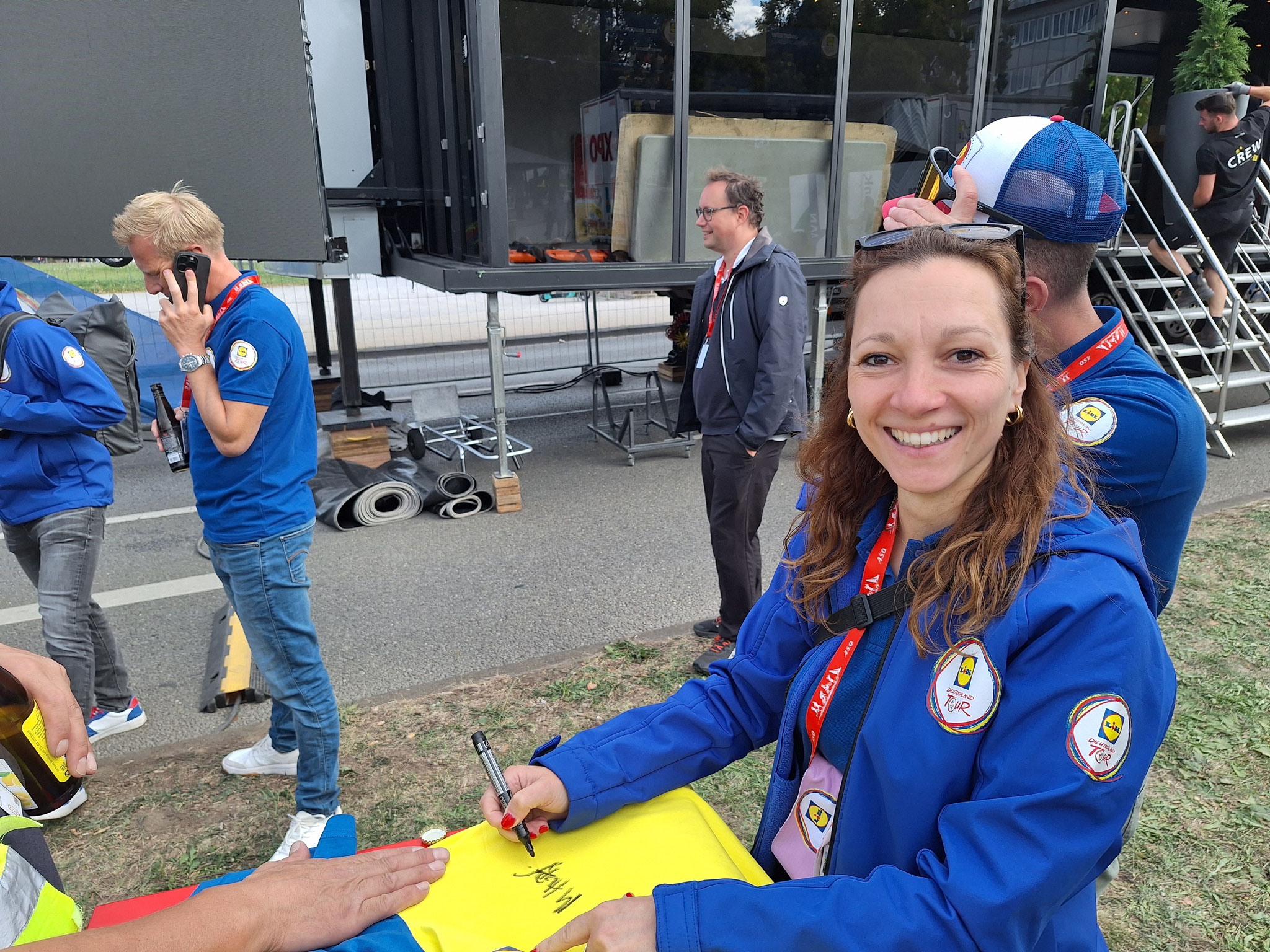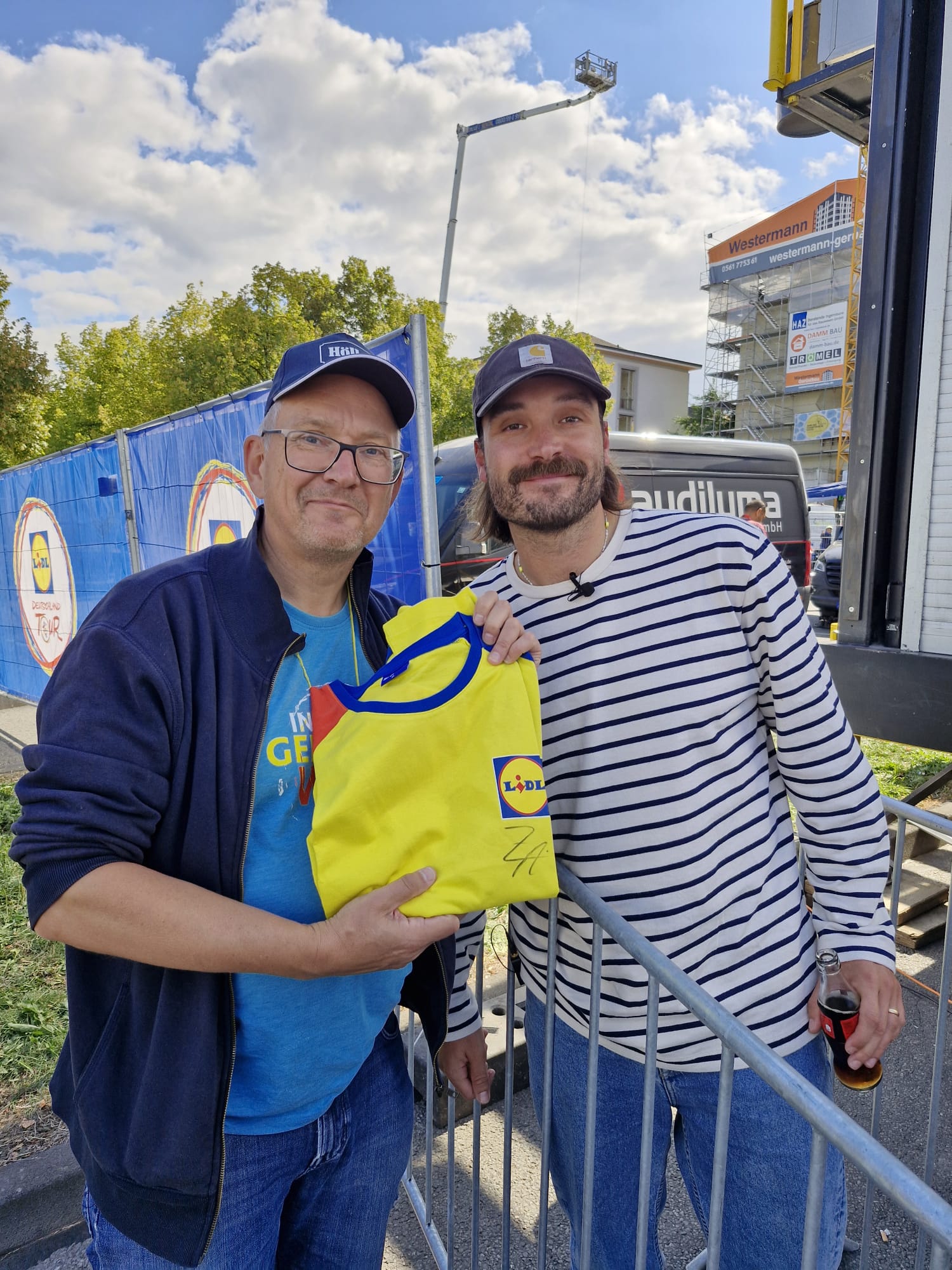 Tour Prominenz unterschreibt Trikot für das beste Stimmungsnest. Kommentator Rick Zabel, Søren Wærenskjoldder - Sieger der 3. Etappe und zu dem Zeitpunkt Gesamtführender, Maren Hopf - Head of Lidl Deutschland Tour - A.S.O. Germany GmbH, und Streckenchef Fabian Wegmann.