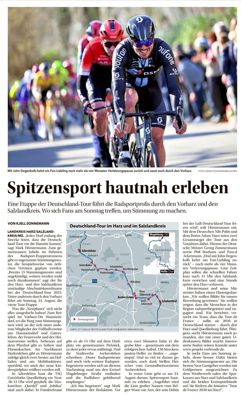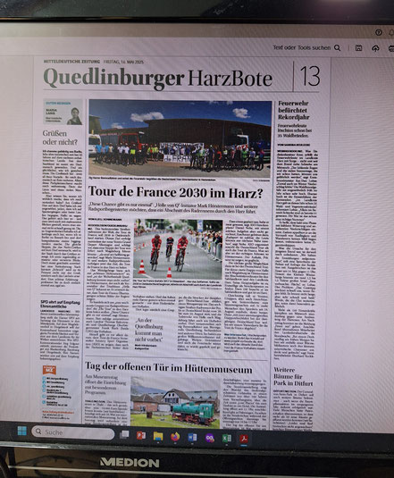 Bei dieser dritten Etappe setzen wir an: Eine wachsende Gruppe von Radsportfreunden will die Tour de France 2030 auch in den Harz holen. Am 15. Mai war der öffentliche Auftakt der Initiative mit 40+ Radsportfreunden. Gemeinsam bereitete man den Streckenverantwortlichen der Deutschland Tour 2025 am Hofladen Hedersleben einen herzlichen Empfang. Die Presse war eingeladen und berichtete.